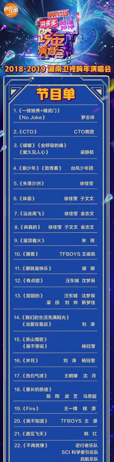 Source: keeplay.net 2020年12月31日 上午2:55 · 3 分鐘 (閱讀時間) 隔了六年新竹的跨年晚會又回來了. 東方衛視:東方衛視跨年直播 (張信哲、騰格爾、鄧紫棋、李健、迪麗熱巴、肖戰) 浙江衛視:浙江衛視跨年直播 (李晨、angelababy、鄭凱、蔡徐坤) 北京衛視:北京衛視跨年直播 (蔡國慶、孟美岐、朗朗、辣目洋子、尤長靖) 4大精彩活動 #live跨年 #虛擬網紅 #跨年煙火 #星座運勢 陪你開心一整晚⋯. 江蘇衛視: 江蘇衛視 跨年 直播 (韓紅、薛之謙、李克勤、許魏洲、硬糖少女303) 東方衛視: 東方衛視 跨年 直播 (張信哲、騰格爾、鄧紫棋、李健、迪麗熱巴、肖戰) 浙江衛視: 浙江衛視 跨年 直播 (李晨、angelababy、鄭凱、蔡徐坤、林俊杰) 北京衛視: 北京衛視 跨年 直播 (蔡國慶、孟美岐、朗朗、辣目洋子、尤長靖) 中央衛視: 中央衛視 跨年 直播 (胡夏、李宇春、吳亦凡. 江蘇衛視: 江蘇衛視 跨年 直播 (韓紅、薛之謙、李克勤、許魏洲、硬糖少女303) 東方衛視: 東方衛視 跨年 直播 (張信哲、騰格爾、鄧紫棋、李健、迪麗熱巴、肖戰) 浙江衛視: 浙江衛視 跨年 直播 (李晨、angelababy、鄭凱、蔡徐坤、林俊杰) 北京衛視: 北京衛視 跨年 直播 (蔡國慶、孟美岐、朗朗、辣目洋子、尤長靖) 中央衛視: 中央衛視 跨年 直播 (胡夏、李宇春、吳亦凡.
